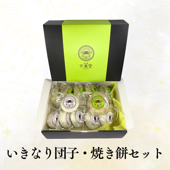 熊本の郷土菓子「いきなり団子」と、昔ながらのやさしい甘さの「焼き餅」を詰め合わせた、天萬堂自慢の贈りもの。